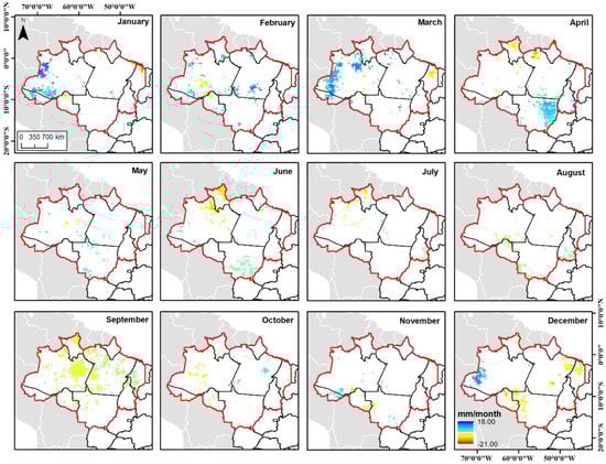 The analysis of pixel-by-pixel monthly rainfall trends (Figure 4) showed similar patterns to the annual and seasonal analysis (Figure 3), with significant positive and negative rainfall trends clustered in few Amazonian regions. Significant negative trends (Sen’s Slope up to −21 mm month−1) occurred in the north of the states of Rondônia, Roraima, and Maranhão, in most of the analysed months. Negative trends observed in September covered a large area throughout the central region of the Amazon. Significant positive trends (Sen’s Slope up to 18 mm month−1) were observed mainly in western Amazonas, especially in the months of January, February, March, and December. It is also important to highlight the positive trends observed in April in the eastern region of the state of Mato Grosso.