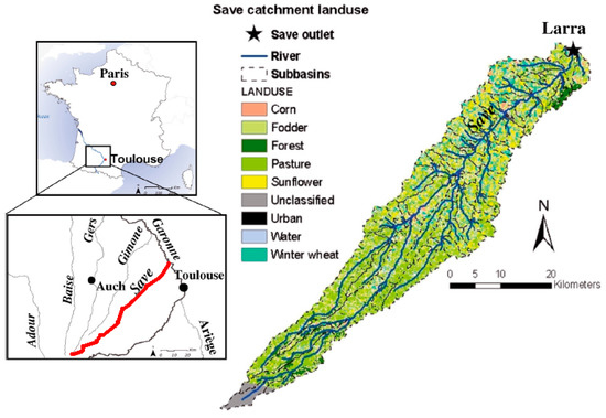 Localization of the Save catchment and the Larra sampling station (triangle) at the outlet. The land use map is extracted from [11].