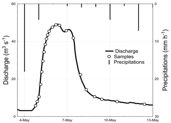 This study concerns the flood event of May 2010. This period coincides with a period of application of pesticides in the watershed. The mean instant discharge increased from 3 m3 s−1 to almost 50 m3 s−1 at the peak stormflow (Figure 2). This flood event was intensively sampled to study the transfer dynamics of organic and inorganic contaminants from the soils to the river in relation to the discharges of the different stormflow components [12].