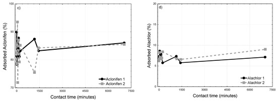 On the other hand, the maximum adsorption of both pesticides occurred in the first few minutes, the equilibrium being reached after 2 h. The total adsorption of 7 different pesticides was estimated to be reached in the first 7 h of contact with river bed sediments [32]. The same time was assessed for the adsorption of 4 different herbicides on soils [33]. Alachlor’s adsorption reached a maximum of approximately 10% whereas 75% of Aclonifen was adsorbed. This difference is due to the different physicochemical characteristics of the pesticides studied. Aclonifen is a non-ionising pesticide with a water solubility of 1.4–2.5 mg L−1 whereas Alachlor has a water solubility of 240 mg L−1, therefore, its adsorption will be less important than Aclonifen [34].