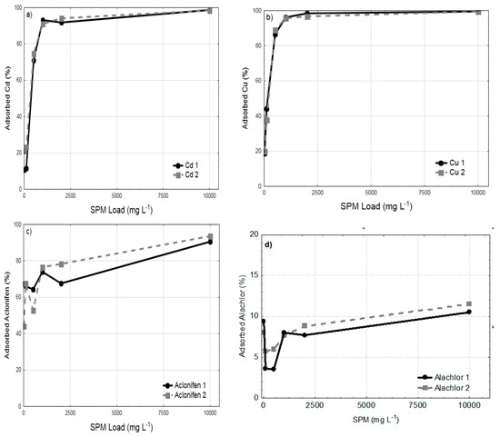 For a given volume of unfiltered river water, a greater abundance of SPM implies a greater quantity of available binding sites. A batch of experiments was therefore carried out to study the extent to which the suspended sediment load could influence the removal of the studied pollutants from the aqueous phase. The aim is to focus on the conditions that are likely to occur in the Save river. Results obtained are plotted in Figure 4. Adsorption percentages of dissolved Cd and Cu, Aclo and Ala as a function of SPM load, showed the same nonlinear patterns. One can note the considerable variability of adsorption extent within the range of low SPM loads (0–1000 mg L−1), before its rapid stabilization.