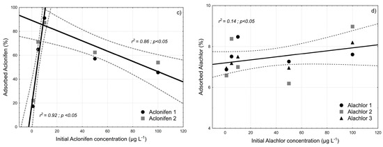 Pesticides presented another pattern with the increase of the initial pollutant concentration. In fact, the percentage of adsorbed pesticides increased with the increase of the initial pollutant concentration until a level where it started decreasing for Aclo and stabilizing for Ala (Figure 5). These non-linear sorption isotherms are due to a modification of the affinity between pesticides and SPM when concentrations increase [38]. The accessibility of a pesticide to the sorption sites in the soil decreases with increasing pollutant concentration [38,39]. The difference between Aclo and Ala could be due to the nature and strength of the bonding between the pesticide and SPM [39].