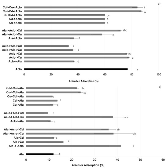 However, TM was the least adsorbed when introduced in a solution where Ala and Aclo were already present. This can be due to a saturation of available adsorption sites on the SPM. For example, the present study showed that when Aclo followed in the solution, Ala tended to be more adsorbed, resulting in a greater occupation of potential sites for Cd and Cu or simply an obstruction of space preventing metals from being adsorbed. Maqueda et al. [5] revealed that the adsorption of Cu on pure montmorillonite increased in the presence of chlordimeform. The pesticide was found to occupy specific sites separating montmorillonite’s layers and thereby facilitating the penetration of Cu.