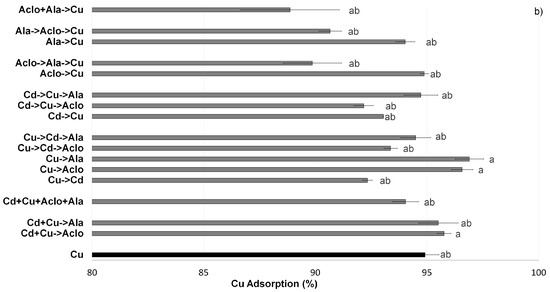 Our results showed that the only significant improvement of Ala’s adsorption was when Aclo followed in the solution (Figure 6), either in the presence or in the absence of TM. The positive effect of Aclo was not visible when it preceded Ala in the solution. It can be concluded that Aclo facilitates the sorption of Ala once adsorbed on SPM but more investigation should be done to understand the mechanisms involved in this interaction.