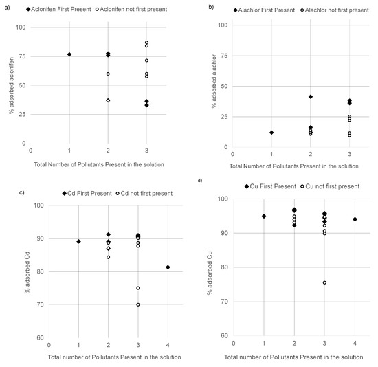 Percentage of adsorption of Aclonifen (a), Alachlor (b), Cd (c) and Cu (d) as a function of the total number of pollutants present in the solution. Present first: the studied pollutant was the first added to a solution; Not present first: the studied pollutant was added to a solution where one or more other pollutants were already present.