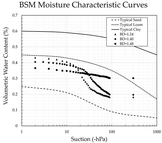 The soil moisture characteristic of BSM at three bulk densities was determined using the hanging water column method with supplementary higher suction data points collected using the pressure plate method at 0.3 bar and 1.0 bar of pressure [22].
