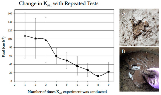 (left) Data represent the mean Ksat value ± standard deviation for n = 12 bioretention cells (trials 1–3); n = 10–12 bioretention cells (trials 4–8); and n = 8 bioretention cells (trial 9). Triangles represent trials at bulk density = 1.25 ± 0.04 g cm−3, circles represent trials at bulk density = 1.41 ± 0.04 g cm−3. (A) A thin layer of fines rose through the bioretention soil with the rising water table during Ksat testing. (B) The thickness of the layer of fines increased up to approximately 0.5 cm over the course of nine Ksat tests over eight weeks.
