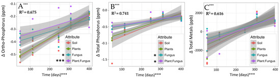 In Figure 5A,B both time and attribute type were significant predictors of the influent to effluent change in phosphorus concentration. The BSM in all mesocosms leached phosphorus throughout the 400-day study period, and the leaching rate was significantly correlated with time. Notably, the phosphorus leaching rate was significantly diminished in the mesocosms inoculated with the fungus. In Figure 5C, time was a highly significant predictor of the total metals movement, and the interaction of soil temperature and biological attribute was a nearly significant predictor of the influent to effluent change in total metals concentration (p = 0.0503). Total metals changed from net export to net retention across the study period.