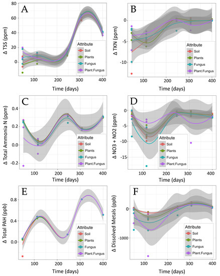 Non-parametric Locally Weighted Scatterplot Smoothing (LOESS) for total suspended sediment (A), total Kjeldahl nitrogen (B), ammonia + ammonium (C), nitrate + nitrite (D), total polycyclic aromatic hydrocarbons (E) and total dissolved metals (F) as functions of time with each biological amendment factor presented independently. All data are presented as concentration removed (positive values) or as concentration exported (negative values).