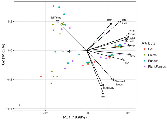 Principle component analysis biplot describing 67% of water quality parameter variance. The observations (colored by attribute) and factor loadings of ten water quality response and three continuous explanatory variables tend to group by time, soil temperature, pH, and TSS.