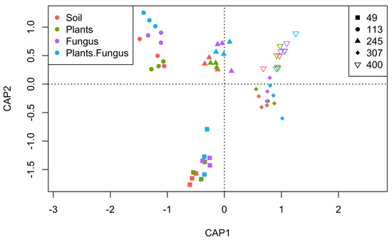 When the data is analysed from the ‘big picture’ perspective based on the combined water chemistry changes, it is clear that time and soil temperature change the water quality to a greater extent than the biological attributes. Figure 8 shows unconstrained distance-based redundancy analysis (dbRDA) illustrating each water quality sampling event for each treatment type as a single unique point where the Mahalanobis distance dissimilarity matrix defines the location of each point in multidimensional space and the bdRDA algorithm ordinates the points by metric scaling along time, soil temperature, biological amendment axes to the bivariate projection of minimum variance. The data clusters primarily according to sampling date (shapes) rather than by biological attribute (color).