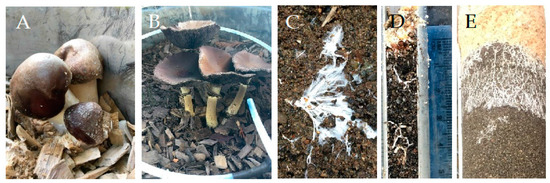 Growth of Stropharia rugoso-annulata. (A,B) Fruiting bodies emerged periodically over the study, confirming growth of the intended organism and verifying that the environmental conditions in the bioretention cell were conducive to its growth. (C) Mycelium growing on the BSM-mulch interface. (D,E) Root-like rhizomorphic mycelium extending down into the BSM both in the field as illustrated by the soil core (D) and in bench scale microcosms (E) made with the same materials (microcosm construction and photo credit: Maxwell Ledeig and Vesta Baumgartner; Mountlake Terrace High School).