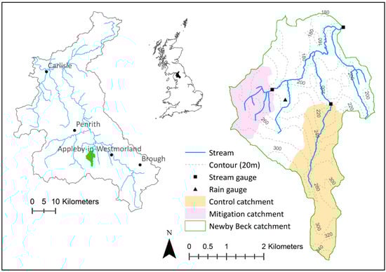 The catchment modelled in the case study (Newby Beck) is one of the three instrumented during the EdenDTC project, located in the River Eden catchment in northwest England [20,31,32,33]. It contains both control and Mitigation sub-catchments of similar sizes (approximately 2 km2) out of a total area of 12.5 km2. Capitals will be used to denote the monitored Mitigation sub-catchment to distinguish it from the modelled one. The main source of sediment in the wider Eden catchment was found to be bank erosion (exacerbated by livestock accessing watercourses and causing poaching), and also caused by streams undercutting the banks leading to instability [34]. Reference [34] found that good vegetation cover ensured that erosion by overland flow entrainment was likely to be a minor source of suspended sediment in the channels; however, field observations made in the EdenDTC project [32] have identified field sources of suspended sediment that become active during runoff events (e.g., tracks and ditches that become transport pathways).