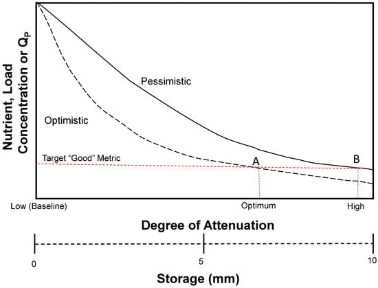 Adding features can then be shown to add storage capacity and thus decrease the value of the output(s) until an optimum target is reached. In terms of a conceptual model of adding attenuation storage to a catchment, it may be expedient to consider the UK Water Framework Directive Targets (WFD-UKTAG) [40] for achieving reductions in TRP concentrations in order to improve the ecological status of the catchments (site-specific values were reported by Ockenden [32]). The two curves shown in Figure 2 could represent different types of RAF with a higher or lower optimum design storage capacity that is required to meet the required optima (indicated by the intersections of the curves and the dashed vertical red lines at points A and B). A similar set of curves relating particulate P (PP) load reduction at the catchment outlet to the managed proportion of the catchment for two large catchments in Austria and Hungary were developed [41] using the PhosFate model. The modelled load reductions were achieved by adopting best management practice (BMP) interventions over part of the catchments. In the U.K., a national scale modelling platform based on the export coefficient method simulated several scenarios of nutrient load reductions [36]. The scenarios relevant to the NBC were based on: (i) on-farm mitigation measures, and (ii) farming practices modified to comply with WFD targets. In (i), the TP export from sheep was reduced by 50% and P fertilizer loads applied to grass and arable crops were reduced by 50%, and in (ii), TP loads from cattle farming were reduced by 25% in addition to the reductions in (i). These scenarios predicted that TP exports would reduce by 22.1% and 32.9% respectively (based on data from the year 2000).