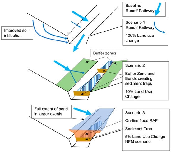Schematic describing Runoff Pathways and design sketches of RAFs in Scenarios 1–3, and Runoff Pathways in the Baseline simulation. Note that Scenario 3 has a widened ditch eating into the buffer zone.