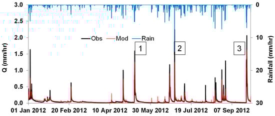 Time series plots of observed (“Obs”) and modelled (“Mod”) (baseline) runoff plus rainfall at the NBC outlet from January–September 2012.