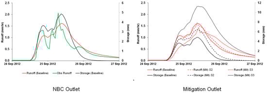 The left-hand pane of Figure 6 shows the modelled and observed runoff at the NBC outlet for Event 3. The modelled attenuation storage per unit time and area (expressed as a depth) is also shown by the solid black line, and both modelled runoff and storage are shown for the baseline case only. The right-hand pane of Figure 6 shows the modelled runoff from the mitigated sub-catchment for the (unmitigated) baseline (solid red line) and Scenarios 2 and 3 (dotted and dashed red lines). The black lines show the attenuation storage during the event for the three simulations (same line styles as runoff). Its value is shown on the right-hand axis and Scenario 3 had a far greater effect on the shape of the hydrograph than Scenario 2 due to the much greater additional added storage (8000 m3 vs. 2000 m3, which is the equivalent of storing an additional 6.4 mm vs. 1.6 mm of runoff during events in the attenuation store). The effect was to both flatten and delay the hydrograph peak due to added attenuation. Both runoff and storage in Scenario 1 were identical to the baseline values as no attenuation storage was added to the model in this scenario, so these are not shown for clarity.