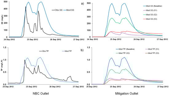 In the left-hand panes of Figure 7a,b, the black lines represent observed concentrations and the blue lines represent the modelled concentrations (at the NBC outlet) from the baseline simulation. The model performed reasonably well in capturing the peak concentrations, although there are some errors in timing of the peaks (compared with the blue line). The model underpredicted the TP concentrations slightly.