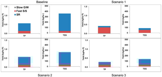 In terms of P yields, Figure 8 shows the modelled yields of TP and SS from the baseline simulation alongside the yields from Scenarios 1–3 from the mitigated sub-catchment. The bars are split into three coloured segments, each representing the yield transported by each of the three flow pathways (SR = surface runoff, “Fast S/S” = fast subsurface, “Slow G/W” = slow groundwater). The sum of the three segments was thus the total yield from all three pathways added together. The results covered a six-month period in 2012. Therefore, these yields included periods of low flows in addition to events; however, based on field observations and the fluxes transported by the modelled flow pathways, surface runoff during events contributed to the vast majority of the total SS and P losses from this catchment.