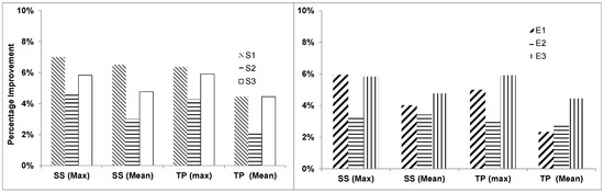 Plots showing the percentage reductions in TP and SS concentrations modelled at the NBC outlet achieved under: LH pane shows the three scenarios (legend indicates the scenario number) relative to the baseline in Event 3 only, and the RH pane shows the improvements under Scenario 3 relative to the baseline only, with Events 1–3 shown for comparison (improvements in Events 1–3 shown with different fill patterns).