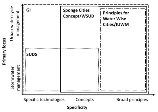A classification of terminology related to the domain of integrated urban water management (IUWM) according to the terms’ specificity and their primary focus (modified from []). GI, green infrastructure; SUDS, sustainable urban drainage systems; WSUD, water-sensitive urban design.