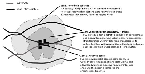 From the viewpoint of urban development, typically three distinct zones can be discerned (see Figure 2). The first is the historical city center (zone 1), which has the oldest building stock and sometimes monuments or buildings of historical value. Surrounding this historical center is an established urban zone (zone 2), which is rapidly undergoing densification. In the periphery (zone 3), there is an ever-expanding urban fringe that consists mainly of newly built areas. Each of these zones require a distinctly different strategy under SCC. In the historical centre (zone 1), the preferred strategy, referred to as “accept and accommodate”, is to prevent floodwater coming from the surrounding areas to enter this zone during periods of heavy rainfall. The historical buildings will be protected against floodwater and floodwater and excessive rainwater in exceptional circumstances will be allowed to enter into or around the sites in a controlled and predetermined manner. In zone 2, the strategy is to “adapt and retrofit” the existing urban fabric and aligns with autonomous urban regeneration processes to restore the health of waterways, mitigate flood risk, and to create public spaces that harvest, clean, and recycle water. This transformation process is slow and will likely take a few decades to reach full transformation. Finally, in zone 3, the strategy aims to create “water-sensitive developments” from scratch (tabula rasa) and newly developed buildings and public spaces will fully comply with the SCC standards (such as to allow for green roofs, underground storage in the floodplain, and ground measures, such as swales and rain gardens in the floodplain, where rainwater is collected within a communal harvesting system).