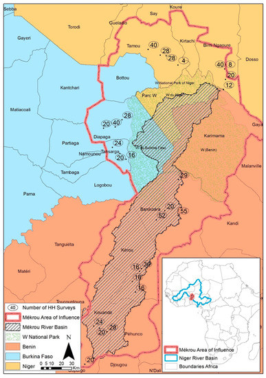Mékrou is a sub-basin of the Niger River, covering an area of 10,635 km², about 3% of the total Niger Basin surface, crossing the borders of three countries: Benin (80% of the basin territory), Burkina Faso (10%) and Niger (10%). The population living in the Mekrou river basin and its area of influence is estimated around 1 million inhabitants, with an average growth of 3.8% per year [29]. Agriculture is the key sector of the economy in the three riparian countries and is critical for poverty alleviation and for food security. In the Mékrou River Basin, arable land is mainly used for food production and for cattle raising.