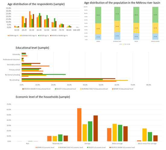 The survey process resulted to the collection of 660 randomly surveyed questionnaires retrieved from the areas of the three countries (Benin, Burkina Faso and Niger) that are located in the Mékrou catchment (Figure 1). 332 questionnaires were collected in 16 villages from the municipalities (called “Communes” in French) of Banikoara, Kouande, Kerou, in Benin. 148 questionnaires were collected in 6 villages from the Communes of Diapaga and Tansarga in Burkina Faso, and 180 questionnaires were collected in 8 villages from the Communes of Falmey and Tamou in Niger. Regarding the surveying and sampling process, specific villages were selected to include a geographically representative sample of the river basin that belongs to the three countries (Benin, Burkina Faso and Niger). The selection process was designed to keep a balance between urban and rural settlements. The number of households proportionally represents the total population of the respective villages or towns selected, as well as it represents the country’s population within the basin. Since there were no available lists of households, the households were selected randomly based on their location in the village/town keeping a distance of five households between the interviewing ones. The survey was carried out by experts of the Joint Research Centre of the European Commission in cooperation with local universities from Benin, Niger and Burkina Faso. Interviews were conducted in person by a team of students supervised by a professor for each country. Before starting the survey, the students received training in which the questionnaire was thoroughly explained and discussed. Since the area is francophone, all the material used was written in French. The fact that the survey was conducted by students of local universities facilitated communication with the local population, overcoming possible language and cultural barriers. Prior to the conduction of the survey the survey country administrators have visited each selected village and informed the local authorities. This process secured the acceptance of the survey on the ground resulting to a 100% response rate. The detailed survey sample per village/country as well as the demographic and socioeconomic characteristics of the respondents are analytically presented in ANNEX A. The detailed Questionnaire (in French) is inserted in ANNEX B.