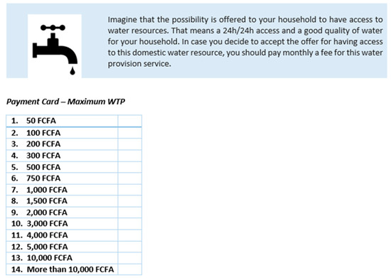 Given the high importance of the domestic water use in Mékrou River Basin, the survey included a Contingent Valuation scenario for estimating the WTP value for domestic water provision network in Mékrou river basin. Under this scenario, the residents of the selected areas were asked to state their maximum (household) monthly fee for a 24 h/day domestic water provision service, by selecting specific payments from a payment card (Figure 3).