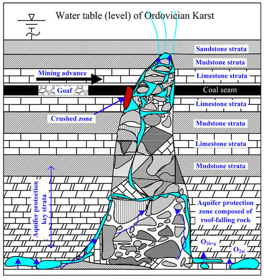 Karst, which is developed and distributed in limestone stratum, is formed by the long-term corrosion of running underground water. Ancient karst caves developed in limestone and continue to expand along with the corrosion of groundwater. Some of these caves even collapse due to the long-term effect of geological tectonic force and the upper cover rock. When the coal-bearing strata overlaying the upper part of these caves also collapse, the coal seam is destroyed. Shaped as a circular or irregular elliptical cylinders, these strata have been referred to as collapse columns, as shown in Figure 1 [9]. When artificial mining connects the aquifer, the collapse column, and mining face laneway with one another, and when the aquifer has large water reserves and a high bearing pressure, the mine water will overcome resistance and enter the main body of the collapse column and even the laneway, thereby causing a water inrush disaster.