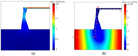 Flow velocity (a) and water pressure (b) distribution of fluid in the water inrush process. A-B-C-D-E is the monitoring line; the coordinates are A: (0,90), B: (150,90), C: (162,205), D: (175,300), and E: (350,300).