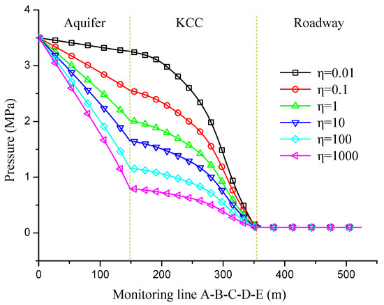 The variation in the value of highlights the influence of permeability on pressure distribution under different working conditions. A smaller and a lower collapse column permeability correspond to a greater pressure decay of the collapse column. The pressure decrease in the aquifer becomes increasingly apparent as the column permeability increases. Meanwhile, a larger corresponds to a lower pressure value in collapse column. When = 1000, the maximum water pressure of the collapse column reduces to 0.79 MPa, which is far lower than the maximum pressure at = 0.01 (3.25 MPa). The boundary conditions of the flow fields are consistent, but the hydraulic pressure of the aquifer and collapse column is obviously different due to the changes in the permeability of the collapse column. Therefore, permeability plays an important role in pressure distribution during the water inrush process.