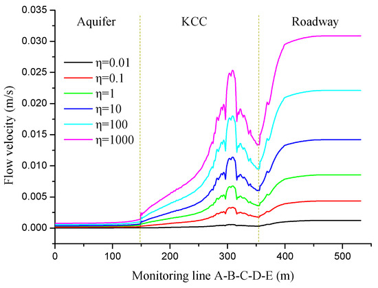 Figure 7 shows the extent of influence of the non-Darcy effect in the aquifer under the influence of the permeability of the collapse column. When constant pressure is applied on the external boundary, the higher permeability of the collapse column corresponds to a higher non-Darcy effect. When the permeability of collapse column changes, it will not only affect the velocity of fluid in collapse column, but also affect the velocity of water flow in aquifer. Because of the connectivity between aquifer and column, the higher permeability of the collapse column corresponds to the higher pressure gradient and water velocity in the aquifer, which will affect the nonlinear behavior of water flow. Therefore, the non-Darcy effect of the fluid becomes more obvious as the column permeability increases. As the permeability of the KCC continues to increase, the flow velocities in the aquifer and the KCC slightly increase. When the permeability of the collapse column is far lower than that of the aquifer, that is, < 1, the non-Darcy effect in the aquifer is very weak and can be ignored. Increasing the value of also improves the influencing degree of the non-Darcy effect. When is equal to 1000, the whole zone of aquifer in the model is almost entirely influenced by the non-Darcy effect.