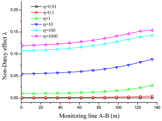 Distribution of non-Darcy effect on the monitoring line at different values of .