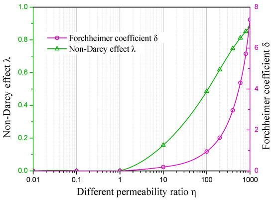 We further analyse the non-Darcy effect in the process of water inrush from the collapse column. Figure 8 shows the Forchheimer coefficients and non-Darcy effects at point C under different permeability ratios. Several flow mechanisms are presented in the Figure. Firstly, when < 1, then the non-Darcy effect is less than 0.1, that is, the non-Darcy effect and existence of inertial resistance in this case are not significant. Meanwhile, the viscous resistance in this case mainly reduces the fluid pressure. Therefore, a Darcy flow is observed. Secondly, if is greater than 1, then the numerical value of the non-Darcy effect shows a substantial increase with the increase of . The inertial resistance and viscous resistance in this case play equally important roles in pressure reduction. The non-Darcy effect cannot be ignored and becomes increasingly intense as the permeability of the collapse column increases. When is close to 400, that is, the permeability of the collapse column layer is 400 times higher than that of the aquifer, the non-Darcy effect is 0.74 and the Forchheimer coefficient is 2.95. In this case, viscous resistance produces a weak influence on the overall pressure drop that can be ignored. Afterward, the inertial resistance begins to dominate and the flow is converted into a high-speed non-Darcy flow. Therefore, the groundwater flow transitions from Darcy flow to high-speed non-Darcy flow. This non-Darcy flow is highly dependent on the permeability of the collapse column that results in groundwater inrush.
