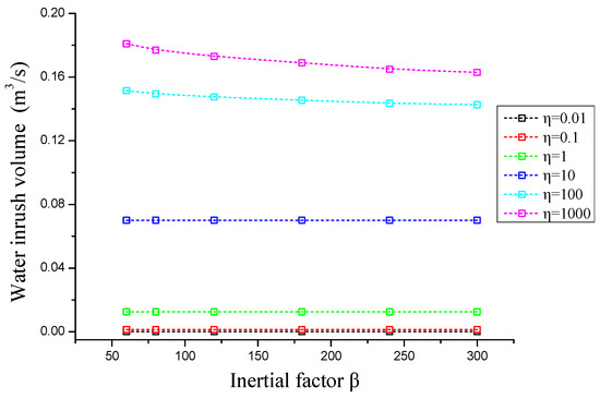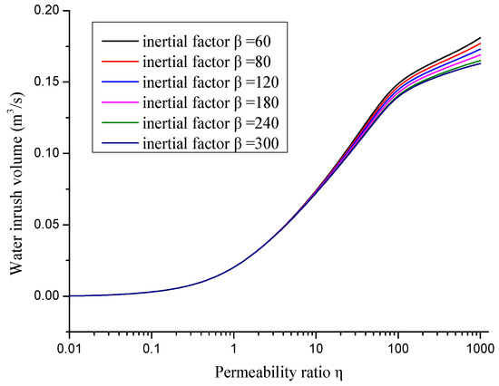 We can also measure the influence of the inertial factor on water inrush volume by changing the inertial factor as shown in Figure 10. As the value of increases, the groundwater inrush volume shows a nonlinear growth trend and the amount of water inrush increases. In other words, an increase in permeability amplifies the porosity of the collapse column, which plays an important role in increasing the water inrush volume. With a changing inertial factor , the water inrush volume changes by a bigger margin with a larger permeability. However, when the permeability ratio is small, the difference in water inrush volume is not apparent.