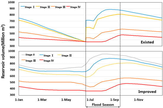 In the case of the attention stage, the supply period was extended from 10 to 15 days for setting standard water volume lines when there was no inflow for the caution-stage water volume in the operation period of the dam–weir link operation council. In case of a drought, the response time was insufficient because stage elevation occurred due to rapid water volume decreases caused by small differences between water volumes by drought stage. To supplement this, the response time of 15 days was set to secure the response time as well as the lead time in which drought stage elevation does not occur in case there is no inflow. Figure 1 compares the existing standard water volume lines and the improved volumes.
