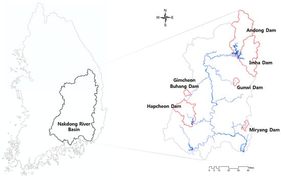 The total water resources of South Korea amount to 129.7 billion m3/year, but the usage is just 26% of this total (i.e., 33.3 billion m3/year). The water supplies provided by dams represent 56% of the usage (i.e., 18.9 billion m3/year), and multipurpose dams alone supply 67.2% of the total amount (i.e., 11 billion m3/year). The total water volume and valid water volume of multipurpose dams in the Nakdong River Basin, which is the target river basin of this study, are 3.2 billion and 2.5 billion m3, respectively, and represent 25% of the total water volume and 28% of the total valid water volume [13]. For the six target dams (Andong Dam, Imha Dam, Hapcheon Dam, Miryang Dam, Gunwi Dam, and Gimcheonbuhang Dam) where the water supply adjustment criteria were implemented to prevent water shortages, the revised standard water volume lines, the water volumes by dam operation with the action plans, and the water volumes by the past dam operation were compared, and the additionally secured water volumes were calculated. Figure 2 shows location of multipurpose dams in the Nakdong River Basin, and Table 3 shows the summarized reservoir capacities of the six dams, which are listed in the dam operation handbook [20].