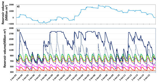 Changes in the total water volume in the Nakdong River were compared and analyzed for each completion year by reflecting the characteristics of multipurpose dams connected in parallel around the Nakdong River (Figure 4). Among the multipurpose dams in the Nakdong River Basin, the Andong, Imha, and Hapcheon Dams have been operating since 1993 and the Miryang Dam was added in 2002. Then, the Gunwi Dam was added in 2011 and the Byhang Dam in 2013. Owing to the influence of the Andong–Imha Dam, which has the largest water volume in the Nakdong River Basin, the trends in water volume are similar to those of the Andong–Imha Dam. From 2008 to 2009 and again from 2013 to 2015, a state of drought began owing to the water volume decreases in the Andong–Imha Dam and Hapcheon Dam, which represented most of the dam water volume in the Nakdong River Basin. Similar to the results of the single dam, the dam water volume using the improved operation criteria was different from that found using the past dam operation criteria. For 1994–1995, 2001, 2009, and 2014–2015, which were the representative drought years in the past, the water volumes on 1 April (i.e., when agricultural water is required for paddy farming) were compared, and additionally secured water volumes were calculated (Table 4).