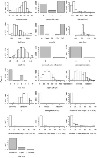 As can be seen in Figure 1, the data set included “concrete”, “PVC”, “PE”, and “PEH”, but also pipes only labelled “plastic”. “Plastic” was the original label and it was kept unchanged. After removing clear outliers, a data set with observations for ca. 6700 pipes remained. Some of these records contained missing attributes, which were estimated using random forest imputation (see Section 2.3 Random Forest). The data set contained ca. 16,600 maximum score observations, since sometimes there were many observations with the same maximum score for a pipe. Table 1 presents the 19 studied predictor variables for each pipe, i.e., a network section between subsequent manholes.