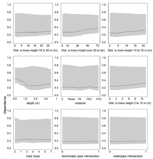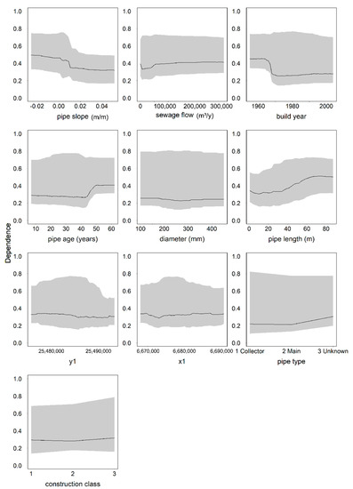Fuchs-Hanusch et al. [11] found that installation year affected pipe condition, whereas in the study by Ana et al. [10] the construction period had no effect. In our study, the partial dependence of pipe condition on the installation year was clear. Inclusion of both the build year and the pipe age was possible because the selected method allowed high correlation between predictor variables.