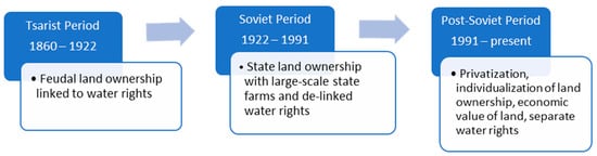 Lands rights in Central Asia underwent three major changes, starting from the Tsarist period until the post-Soviet time, and in each instance land rights affected water rights (Figure 1).