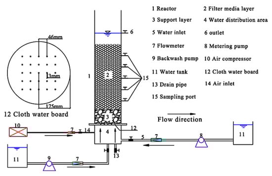 An up-flow BAF reactor is presented in Figure 1. The reactor was designed with a height of 1470 mm and a diameter of 350 mm. The UBAF reactor included a support zone of 200 mm, formed by an accumulation of cobble with a diameter of 10–30 mm and a height of 200 mm. The upper layer of the support zone consisted of ceramist material with an effective diameter of 3–5 mm and a void ratio of 0.43. The height of filter media layer was 850 mm. The perforated plate was used to ensure the distribution of the water and air inside the reactor at the bottom of the support zone. The top of filter media layer was set to a water zone of 150 mm. Six sampling ports were designed along the depth of the reactor at 100–150 mm intervals. The air was introduced into the reactor via air compressor, which was installed at a 150 mm depth. A flow meter (LZB-4, Yin Huan, Changzhou, China) was used to determine the aeration rate. A mechanical diaphragm pump (GM0090PR9 (6) MNN, Nan fang Pump, Hangzhou, China) was applied to pump the synthetic wastewater into the bottom of the reactor.