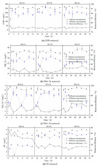 Figure 2 shows the levels of COD, NH4+-N, NO3−-N, and TP removal at various aeration rates in the UBAF reactor. In Figure 2a, the average concentration of COD in influent and effluent were 257.47 ± 17.99 mg/L and 23.38 ± 9.34 mg/L, respectively. The effluent concentration of COD was 50 mg/L based on the China standard limit. The COD removal efficiency did not show apparent fluctuations (R = 0.169, p = 0.464) with the increase in aeration rates (from 40 L/h to 90 L/h). The average removal efficiencies of COD at aeration rates of 40 L/h, 65 L/h and 90 L/h were 89.49%, 91.86%, and 90.61%, respectively. The small difference in COD removal efficiency could be interpreted simply by different degree of denitrification which consumes organic carbon. The result was consistent with previous research [3,5,8]. Tao et al. [5] found that COD removal efficiency reached to 89.38 ± 1.04% in the reactor. Hasan et al. [3,9] showed the insignificant effect of different aeration rates (Q ≥ 3 L/h). Thus, the UBAF reactor demonstrated a good treatment efficiency on COD removal.