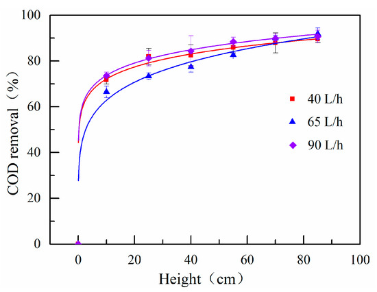 Figure 3 shows the results of COD removal at different filter media heights. The COD removal had a significantly positive correlation (R = 0.910, p = 1.60 × 10−7) with the filter media heights. The COD removal mainly occurred at the bottom of filter media layer. COD removal efficiency at 0–25 cm height of filter media reached 81.9 ± 3.60%, 73.34 ± 1.46%, and 81.22 ± 3.41% at aeration rates of 40 L/h, 65 L/h, and 90 L/h, respectively. However, at 25–85 cm height of filter media, the removal efficiency only reached lower values, 7.59%, 18.52%, and 9.39% at aeration rates of 40 L/h, 65 L/h, and 90 L/h, respectively. These changes in removal efficiency likely reflected the differences in the organic matter concentration at different heights. The layer at 25–85 cm height concentrated lower levels of organic matter when compared with the bottom of filter media layer. The high organic matter condition might lead to the microorganism abundance increasing, similar to the findings in previous studies [11,18].