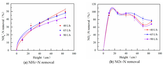 Figure 4 shows the results of NH4+-N and NO3−-N removal at different filter media heights. NH4+-N removal had a significantly positive correlation (R = 0.933, p = 1.73 × 10−8) with the filter media heights in Figure 4a. At 0–25 cm height of filter media, the filter removed more NH4+-N than those observed under other filters. At 25–85 cm height of filter media, when filter media heights increased by 15 cm, the rate of NH4+-N removal remained constant that were 5.02%, 4.15%, and 3.56% at different aeration rates, respectively. The results were mainly related to the supply of DO and the distribution of organic matter. However, the NO3−-N removal showed a significantly negative correlation (R = −0.817, p = 3.52 × 10−5) with the filter media heights and differed from the NH4+-N removal in Figure 4b. The removal efficiency of NO3−-N reached 94.85 ± 3.95% at filter media height of 0–10 cm. At 10–25cm height of filter media, NO3−-N removal efficiency did not change. NO3−-N removal tend to decrease at 25–85 cm height of filter media. The NO3−-N removal occurred as result of the biological denitrification process in the UBAF. The low DO concentrations (less than 0.5 mg/L) induced to the denitrification process [4]. Table 1 also showed that DO concentrations at the bottom of filter media remained lower than that observed under other layers. Therefore, the DO distribution likely explained the NO3−-N removal. In addition, aeration rate did not affect the removal of nitrogen at different filter media heights significantly. The aeration rates of 40 L/h and 65 L/h removed NH4+-N and NO3−-N more efficiently than the aeration rate of 90 L/h. Previous researches with BAF system also reported similar results of NH4+-N and NO3−-N removal [19].