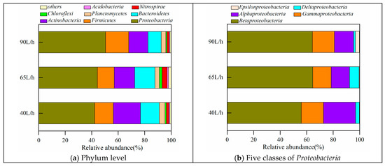 Microbial community composition at the phylum and class: (a) Phylum level at different aeration rates; (b) five classes of Proteobacteria at different aeration rates.