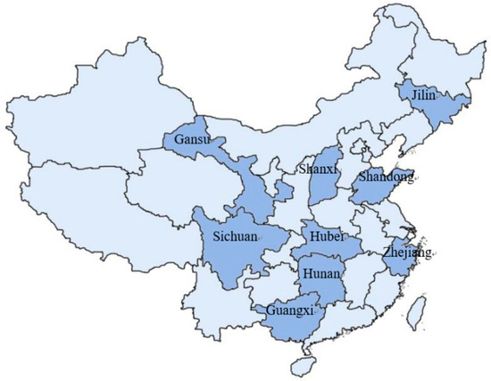 In our study, supervised monitoring data carried out by local environmental protection authorities from Oct. 2016 to Mar. 2017 of concentrations of 14 heavy metals and metalloids discharged from more than 800 WWTPs located in nine provinces were used. These nine provinces were Jilin, Shanxi, Shandong, Zhejiang, Hubei, Hunan, Guangxi, Gansu, and Sichuan, which covered the northeast, northwest, north, east, south, and the southwest of China (Figure 1), including the higher heavy metal pollution level regions as Hunan, Guangxi, and Gansu [10]. The WWTPs from data sources of different sizes covered various ratios of industrial wastewater treated, classified as <50%, 50–70% (including 50%) and ≥70%. In this way, the selected WWTPs were representative of Chinese WWTPs for locations, sizes, and ratios of the received industrial wastewater.