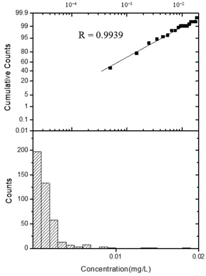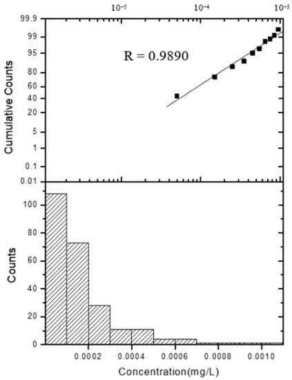 When considering some of the undetected data, the delta-lognormal distribution provides a reasonable and practical basis for further analysis of the heavy metal and metalloid data and determining the discharge limits, which is in accordance with the EPA regulations [11,25,34]. The delta-lognormal distribution consists of two parts, undetected numbers and detected numbers conforming to the lognormal distribution. The distribution function of delta-lognormal distribution can be expressed as [11,25,34]: