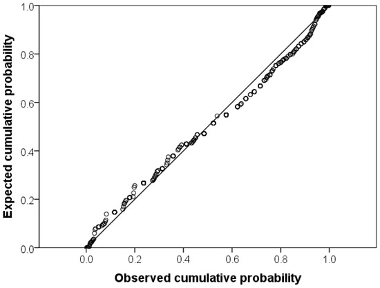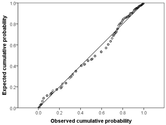 Among the 1080 Hg discharge figures that were collected from 872 WWTPs, 792 indicated that no mercury was detected and 288 indicated mercury had been detected. Among the 925 As discharge data from 858 WWTPs, 387 were not detected, while 537 were detected. While using the detected daily average data, as shown in Figure 2 and Figure 3, it the lognormal distribution was visible for both Hg and As detected according to the fitting lines with the logarithm of Hg or As concentrations on the horizontal x-axis against the normal probabilities on the vertical y-axis. This distribution was also verified while using the P-P graph test (Figure 4 and Figure 5) with the fitting lines of cumulative probability of monitoring data after logarithmic transformation against the expected cumulative probability. The lognormal distribution of effluent concentrations is also consistent with other research [7,33].